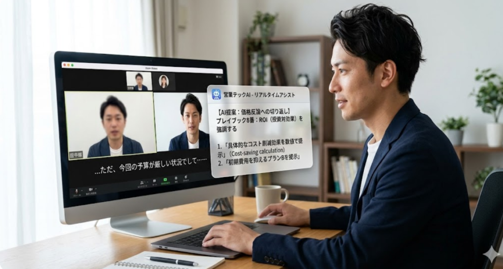 ZoomやGoogle Meetでの商談中、AIが顧客の発言(例:「予算が厳しい」)を認識し、画面上にプレイブックの「7番:価格反論への切り返し」を瞬時にポップアップさせます。