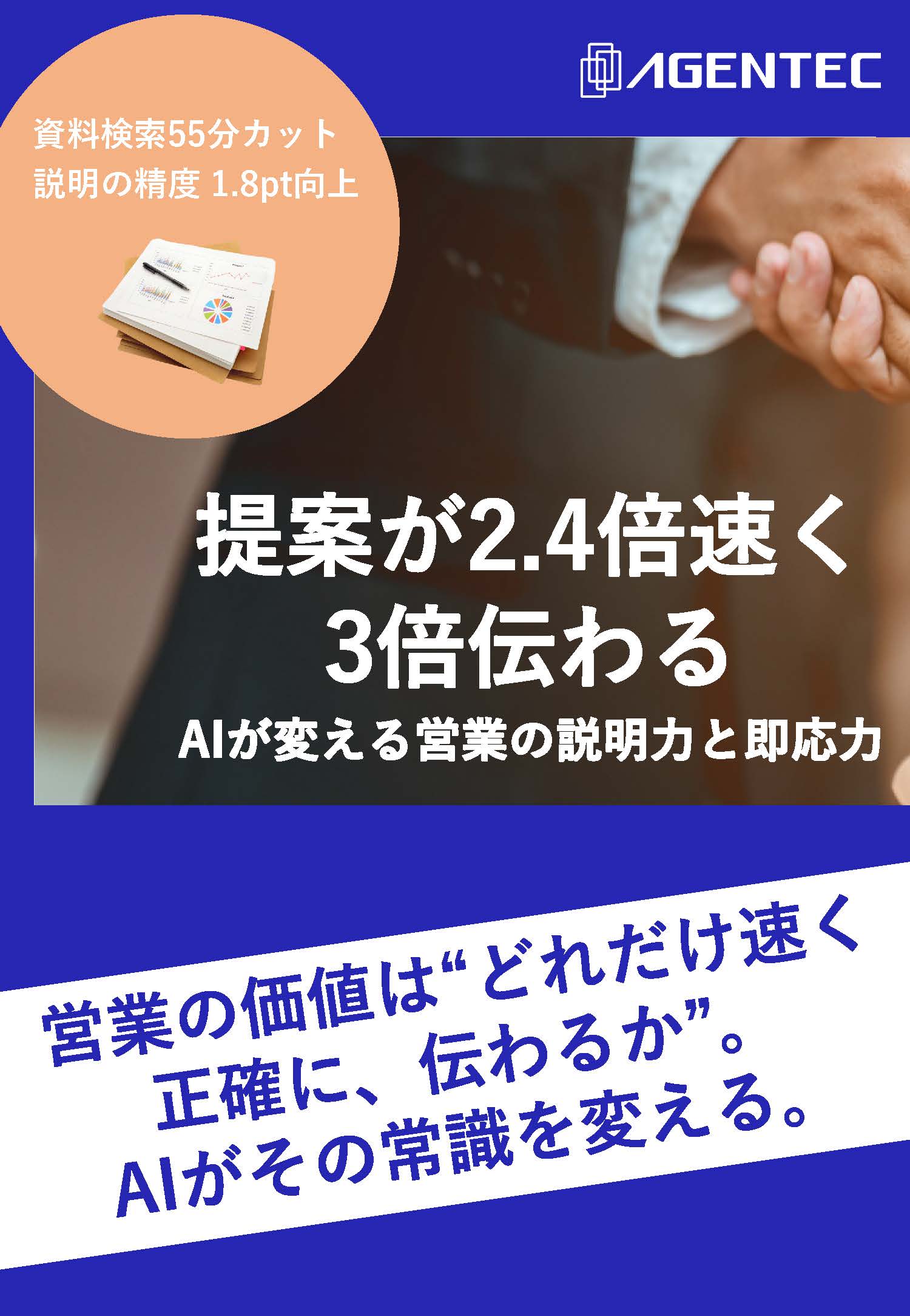 提案が2.4倍速3倍伝わる―AIが変える営業の説明力と即応力 2025.10.082025.10.17 この資料でわかること 第1章:営業は“スピード勝負”の時代へ 第2章:なぜ営業はすぐに答えられないのか 第3章:AIが変える営業スピード― “資料を探す時間”をゼロにする 第4章:提案が3倍伝わる理由― AIが支援する説明の再現性 第5章:成果― スピードが信頼を生む営業へ 第6章:まとめ・今後の展望― スピードが営業の信頼を再構築する 貴社名 * お名前 * お名前カナ メールアドレス * 個人情報取扱い同意書に同意する 個人情報取扱い同意書